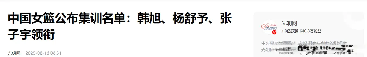 光明网——中国女篮公布集训名单:韩旭、杨舒予、张子宇领衔